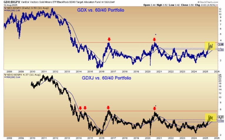GDX against the 60/40 Portfolio is acting quite bullish and could threaten to break out from a 12-year-long base. That could initiate a major leg higher in the miners and juniors.