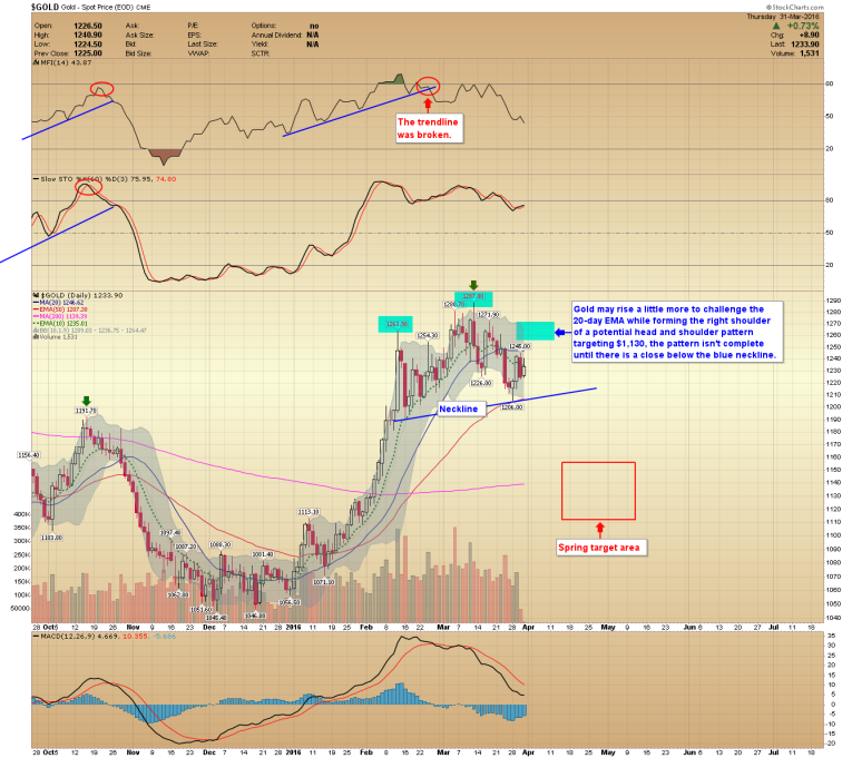Gold may rise a little more to challenge the 20-day EMA while forming the right shoulder of this potential head and shoulder pattern targeting $1,130; the pattern won’t complete until there is a close below the blue neckline.