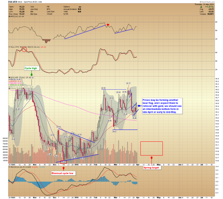 Silver prices may be forming another bear flag, and I expect them to rollover with gold, we should see an intermediate bottom in late April or early to mid-May.
