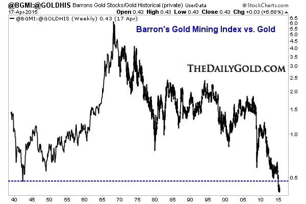 Below we plot the Barron’s Gold Mining Index (BGMI) against Gold. The BGMI dates back to 1938. The ratio recently touched its lowest level in at least 77 years! There might not be anyone alive today who has seen gold stocks this cheap relative to Gold.