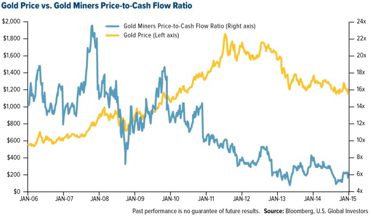 The next chart plots the price to cash flow valuation for senior gold miners. Twice in the past two years it touched a low of about 5. According to data from BMO, this is even lower than during the secular bottom of 2000 when senior miners traded at 6x-7x cash flow.