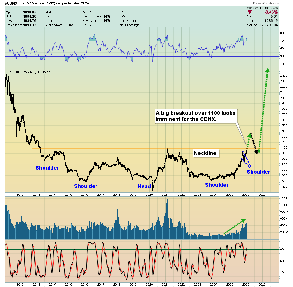 Here is what I continue to view as one of the greatest base patterns in the history of markets, the CDNX inverse H&S pattern. I’ve suggested the breakout could accompanied by a long-term rates breakout and that prediction looks set to materialize in a magnificent way. My long-term target for the CDNX is 10,000 and many key juniors are almost certain to become “thousand baggers” even before that target is reached.