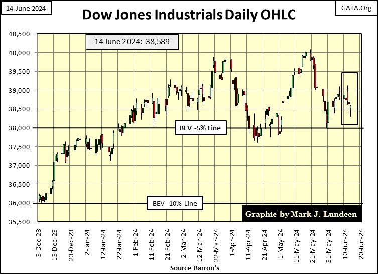 That is a shame, as to do exactly that, one only has to exit the market should (when) the Dow Jones closes below its BEV -10% line in its BEV chart above, or 36,000 in the daily bar chart below, and absolutely refuse accepting market risk (buying stocks), until the Dow Jones once again closes above its BEV -5% line (38,000). In other words, at a market top; stay in scoring position, or stay out of the market.