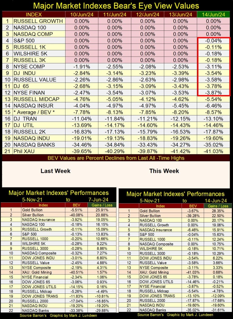 Moving on to my table of major market indexes BEV values below, the stock market at first glance was bullish this week, as seen with all those BEV Zeros in the table. But at the week’s close, the market ended on the weak side, with only three indexes closing with BEV Zeros on Friday. I placed a red box over the indexes closing the week in scoring position. On Friday’s close, the Russell Midcap (#13) and NASDAQ Insurance indexes (#14) were knocked out of scoring position. Not good, but not something to panic about.