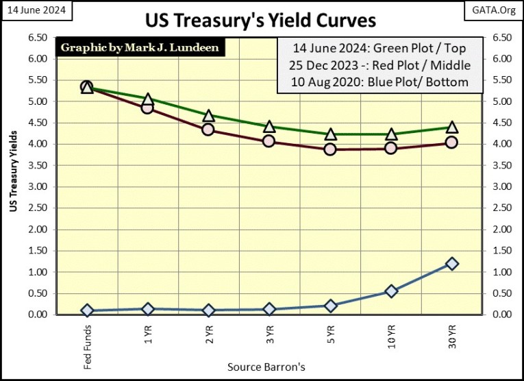 So, why are the idiots struggling with deciding to hold, or lower interest rates? I think a chart of the yield curve will help clarify their predicament. Since December (Red Plot below), bond yields have risen slightly, to where they were at the close of this week (Green Plot), with the FOMC’s Fed Funds rate being nailed on the yield curve, at 5.33% since last summer.
