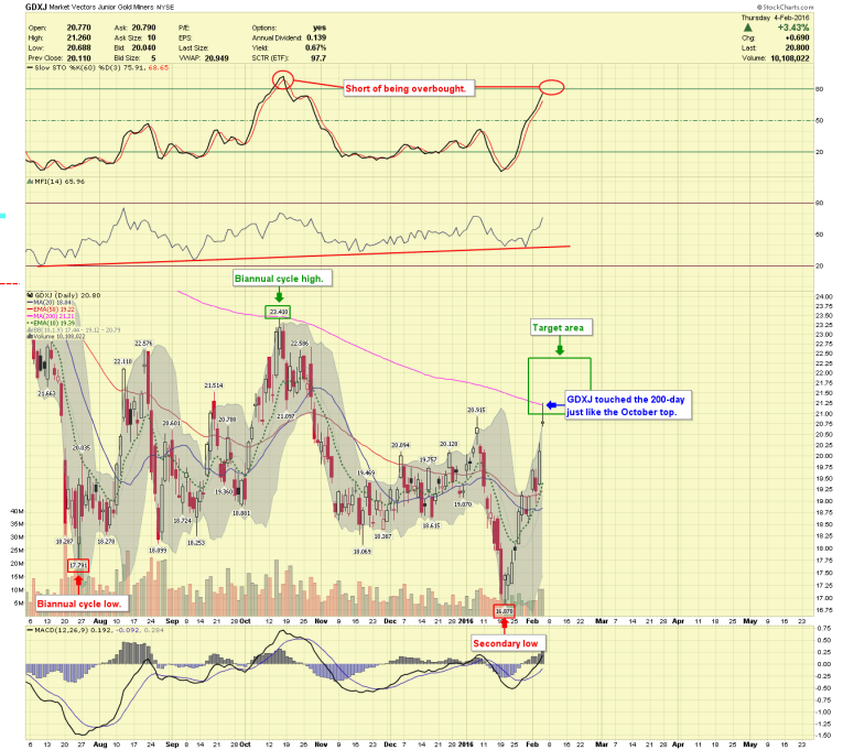 The dollar finally broke through the cycle trendline Wednesday, giving metal prices a boost into their target areas; the dollar should make a cycle low rather soon. Gold drove deep into the target box and has now become oversold; these conditions are often seen near biannual cycle tops. Silver captured the rally we were looking for, but prices are still a little short of the target area. Miners have reached their target zones and could form tops any day. I will be looking for confirmed price swings and other topping signals over the next few days. We will update as often as necessary as the top comes in.