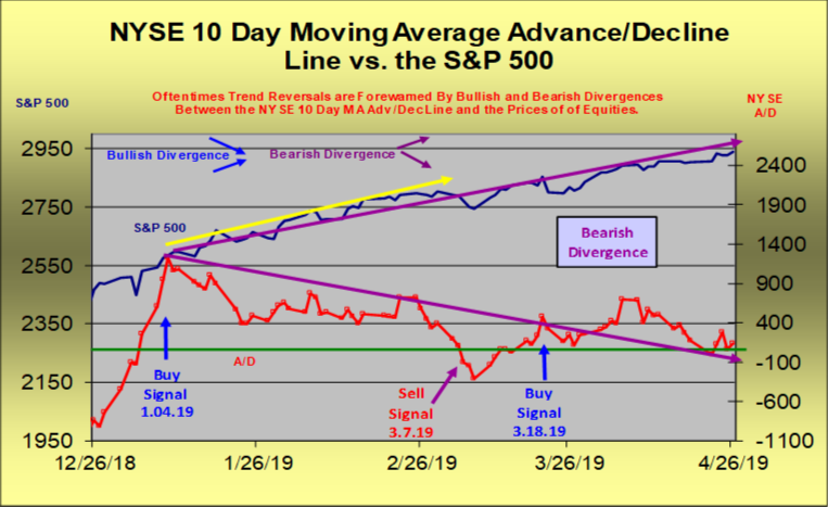 Breadth is becoming a problem for the long-term prospects of this stock market rally from December 2018. Below we show updated charts of large and growing Bearish divergences between the major averages and their 10-day average Advance / Decline Line Indicators and their Demand Power measures. What this is telling us is the recent rise in the market is coming on the shoulders of fewer stocks. This is also telling us that stocks are approaching a top.