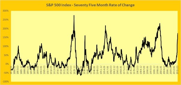 Since the depth of the March 2009 bottom, the U.S. stock markets have more than trebled, having risen by about 215%2 over a period of 75 months. Figure 1 shows the 75-month rate of change for the S&P500 Index for the last 140 years. The reason for using a 75-month rate of change is that the length of market’s current move from its trough is 75 months. Clearly, the current rate of change is in extreme territory and is exceeded only by three other market up-moves: the roaring bull market of twenties leading into the Great Depression, the bull market of the fifties and the technology boom. Further, the trajectory of the up-move is similar to that of the market leading into the highs of 1929 and the highs in 19383.