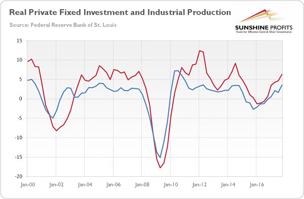 Jobs are plentiful and there are no bottlenecks in the labor market, which could signal overheating. Fixed private capital spending and industrial production have been accelerating recently, as one can see in the chart below. And that growth is not limited to the U.S., but it occurs worldwide, as we discussed it in the previous edition of the Market Overview.