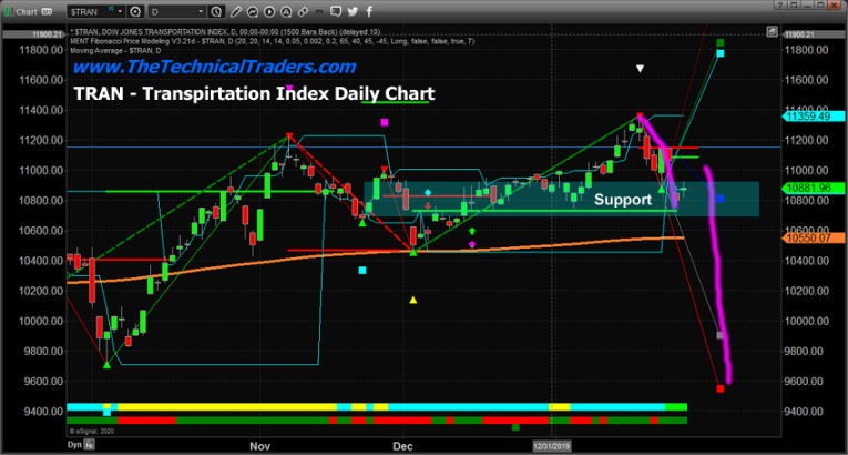 This Daily TRAN chart highlights the recent breakdown in price that could be considered the first tier of the waterfall event. The support level, highlighted in LIGHT BLUE, suggests price may attempt to stall near 10,800 before any further price breakdown happens. A second waterfall tier could push the price well below the 10,000 level as the next real support exists near 9,9250.