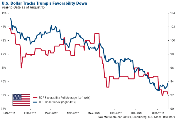 Returning to the dollar for a moment, respected CLSA equity strategist Christopher Wood writes in this week’s edition of GREED & fear that it’s “hard to believe that the political news flow in Washington has not been a factor in U.S. dollar weakness this year.”