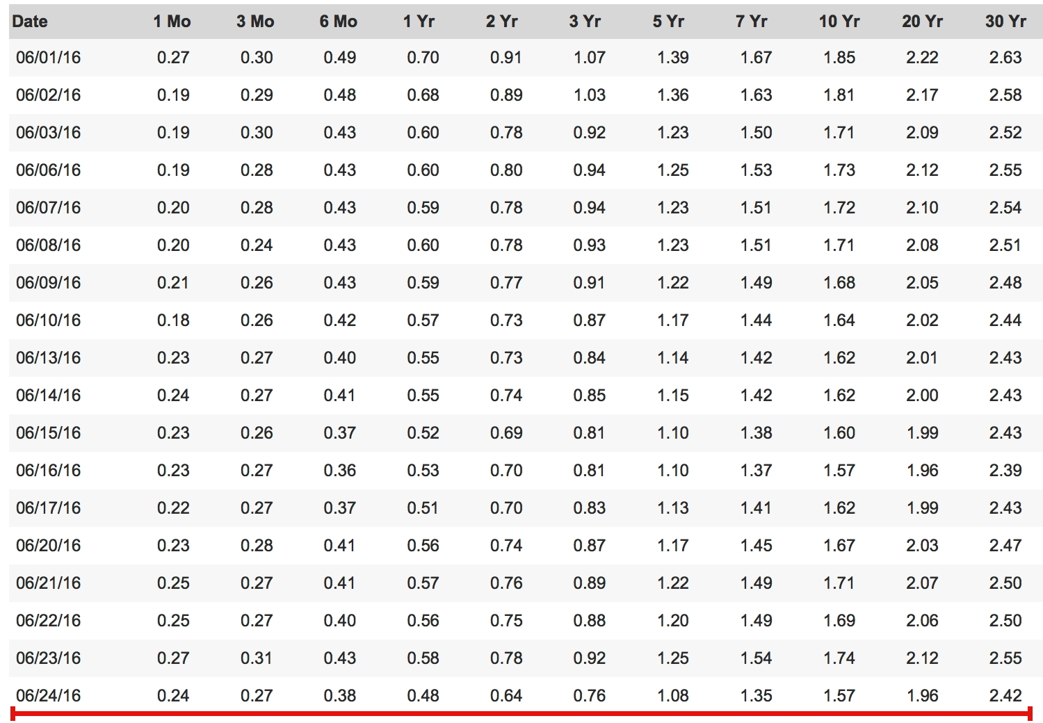 Possibly even more important that the perhaps foolish ‘flight to safety’ is the effect it will have on interest rates. Much of the yield curve in the US is already negative. The Core CPI as released by the Bureau of Labor Statistics shows that prices rose 2.2%. Note the yield chart below for the month of June 2016, particularly the last row – the day after Brexit: