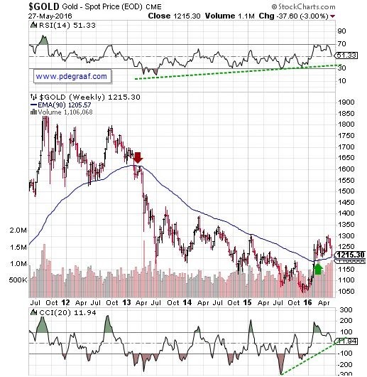 Featured is the index that compares gold to the S&P 500 index. Since 2011 the S&P outperformed, while gold corrected. Since December, gold has taken the lead again, and price is now back at the rising (for the first time in several years) 200 day moving average (red line). The green arrow points to an ‘upside reversal’ that occurred on May 31th. Reversals often indicate that a trend change is taking place. The 50 DMA has moved back into positive alignment with the 200DMA (green oval). The supporting indicators have landed at previous support levels (green lines).