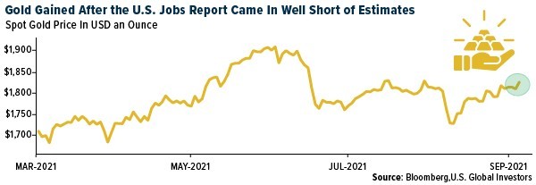 - The best performing precious metal for the week was silver, up 2.87%, outpacing gold on the sensitive jobs report update. Gold jumped after a key labor-market report showed the U.S. economy added fewer jobs than forecast, diminishing the possibility that the Federal Reserve will taper stimulus soon. Nonfarm payrolls data showed the U.S. added 235,000 jobs in August, well below economists’ forecasts and far less than the gains seen last month, reports Bloomberg. The dollar sank after the report, boosting gold. Bullion has struggled this year amid a global economic rebound from the pandemic, which has raised the prospect of central banks reining in their monetary stimulus.
