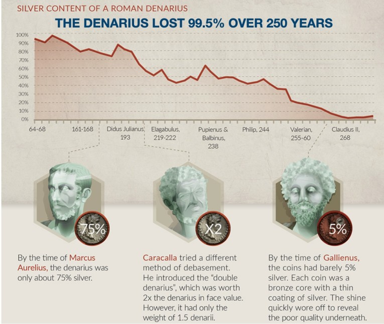 The peak of the Roman Empire was around the birth of Jesus. The decline started gradually, and by the time of Marcus Aurelius (161 AD), the Denarius, the Roman silver coin, was already down 25%.