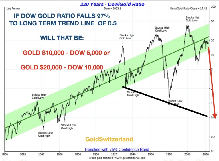 With the bubble in stocks bound to burst at some point, whether it is soon or in the next few years, I wouldn’t be surprised to see the Dow vs Gold ratio decline by 75-95%.