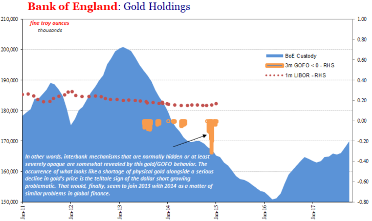 The first time MM GOFO goes negative is April 12, 2013 and again on the 23rd but it is not until mid-May that the rate moves into solid negative territory. It is as this point that a significant amount of gold at the Bank of England starts to be withdrawn. When MM GOFO returns to positive in mid-2014, the Bank of England holdings stabilize but then fall again once MM GOFO drops below zero for the second time.