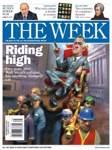 The following week Time featured a story with the headline, “Can Google Solve Death?” on its front cover. Google represents one of America’s biggest corporate monoliths, and an article suggesting that even death itself could be conquered by the juggernaut is indicative of excess optimism which is normally seen at market tops. The cover graphic on a recent issue of The Week suggests complacency about the outsized role of Wall Street in the U.S. economy and was also suggestive of a top.