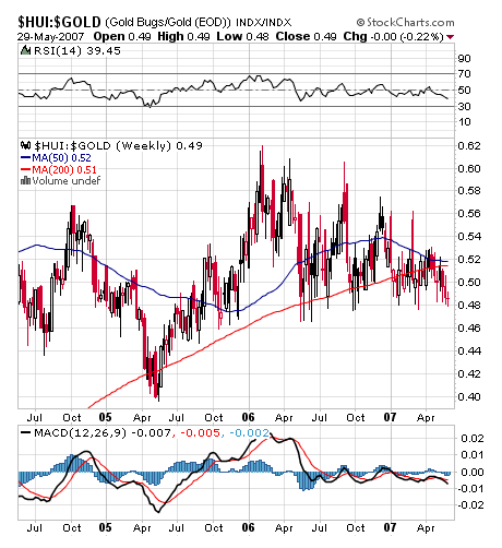 If the $XAU and the $HUI start to rise relative to the gold price, this might give rise to an unintended consequence. Investors may come to argue: "Gee, look the shares are bottoming and/or rising. That usually precedes a bottoming and/or rising in the gold price itself"