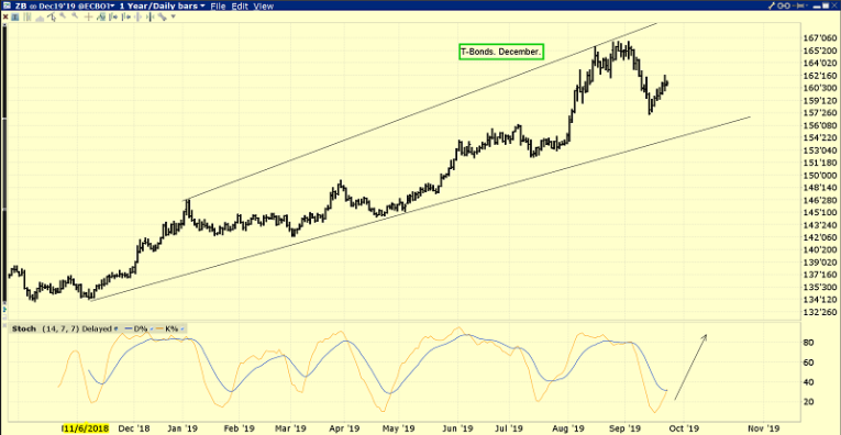 The chart of US T-bonds. Note the buy signal in play on the 14,7,7 Stochastics oscillator at the bottom of the chart.