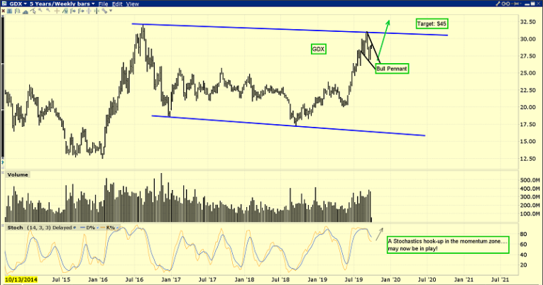 The superb GDX weekly chart. After a “flagpole” rally began in May, a bull pennant pattern is now in play. The bottom line: