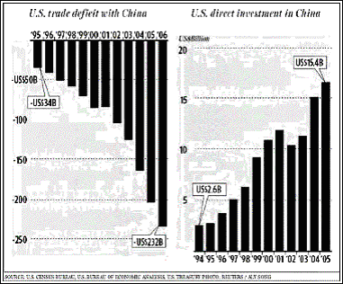 Something deadly and different can be identified. The cooperation identified by constructive contracts between US corporations to build Chinese factories took a respite in 2002 and 2003, but clearly resumed to surpass $15 billion annually in 2004 and 2005 each year. If one needs to point fingers at the new problems with China, look no further than US corporate executives who plowed tens of billion$ into China, killed off US jobs, and have fed the dragon. However, the end of the rigid yuan currency regime was removed in July 2005 with little progress to show in a yuan upward revaluation. A relatively small 7% rise in the yuan since then pales by comparison to the 55% rise in the euro currency (versus US$) since 2001, and 15% rise in the euro in roughly the same time frame as the yuan has been relaxed, but not freed. The failed monetary policy of USGovt leaders has been exposed, when dealing on the economic and financial chessboard with patient and crafty Beijing leaders. Our guys might not be all too blessed with a good hand in this poker game, since we dealt twice as many cards to the Chinese side of the table.
