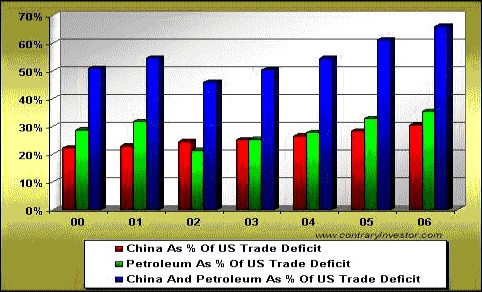 Max Wolff points out that four leading finished product exporters (China, Japan, Germany, Singapore) supply 37.0% of the world's capital, and that six leading oil exporters (Russia, Saudis, Kuwait, UAE, Algeria, Venezuela) supplied 29.3% of the world's capital in 2006, while the United States imported 64% of that capital in 2006. This end result is a grotesque perversion of anything either John Maynard Keynes or his ilk ever imagined. Such is the bitter fruit of managing a fiat currency. The reality is that Russia dominates in energy supply, grabbing geopolitical power as it uses energy as a weapon. The reality is that China dominates in manufacturing, grabbing geopolitical powers as it exploits its universal (not specialized) labor cost advantage. The United States is acutely vulnerable to foreign dependence upon foreign-made finished products, and foreign energy supplies. Together, China and Petroleum imports account for 65% of the US trade deficit.