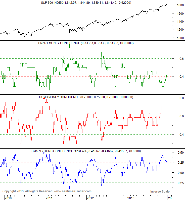 As you can see in the following chart, dumb money traders are becoming more and more confident the further this parabolic move progresses. Professional traders, on the other hand, get more and more nervous as the market stretches further and further above the mean.