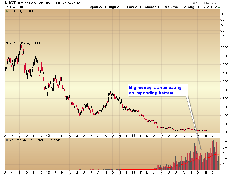 Once we have confirmation that the final bottom has been printed, I'm expecting at the very least an initial surge over the first 3-4 months to test the 2012 resistance zone. That would be a move of almost 100% (see HUI chart below).