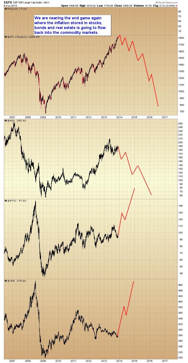 I would argue that we are now about to begin a second stage inflation again. It appears that rising interest rates have already pricked the echo bubble in the real estate market, and at five years the bubble in the stock market is almost certainly in the final euphoria stage. Once stocks begin to stagnate and rollover we are going to see that same process that we saw in 2007/08 as inflation leaks out of stocks, bonds, and real estate and moves back into the commodity markets.