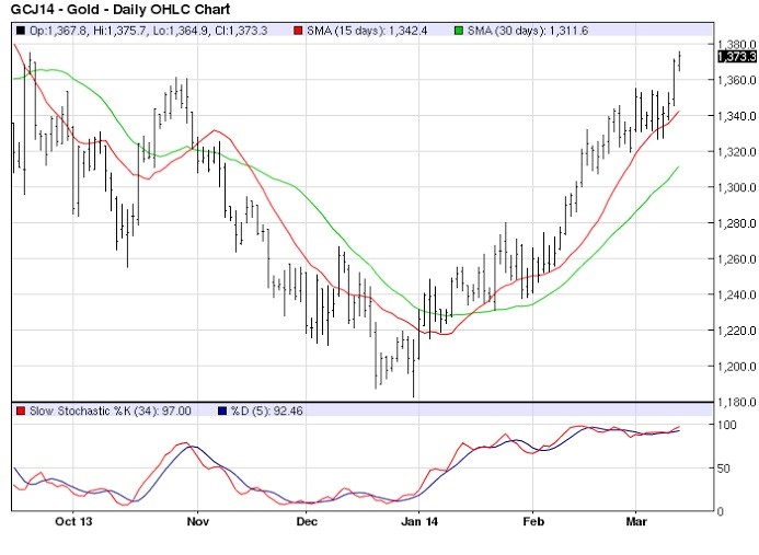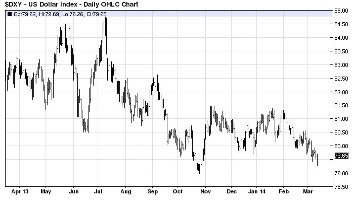 Goldman’s chief commodities analyst, Jeffrey Currie, said that turmoil between Russia and Ukraine doesn’t alter the firm’s bearish view on gold. He also told Bloomberg that lower mining costs means that it’s “more probable than it was six months ago that prices would drop below $1,000.” Goldman seems to be grasping at straws in its attempt at rationalizing a blown bearish call. Moreover, the firm believes a strengthening dollar will weigh against the metals based on the expectation of accelerating U.S. economic strength. Yet the dollar has shown no sign of strengthening as yet but instead continues to grind lower and is testing a major low.