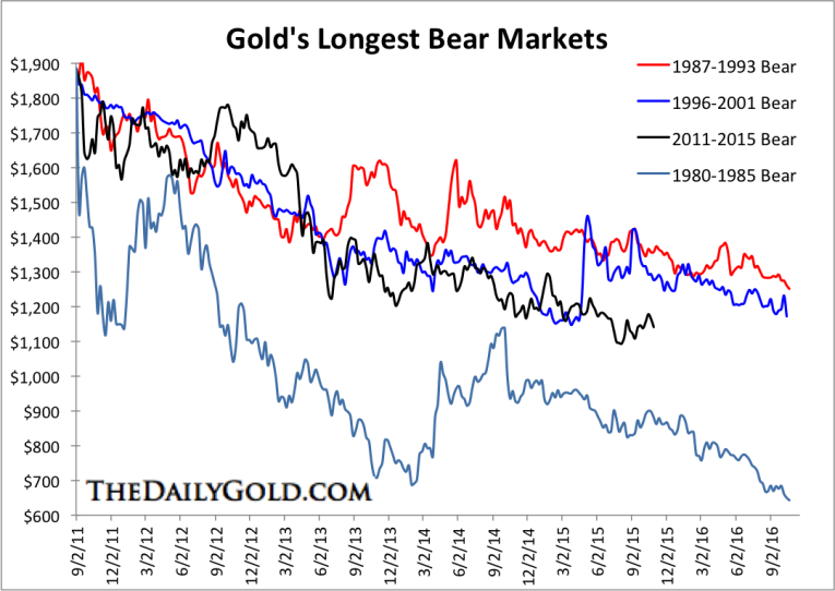 In order to give the current bear market in Gold proper context we looked at the absolute longest bear markets from the past. It turns out that three bears have lasted a full five years before a sustained rebound. We already know of the 1987 to 1993 bear. In regards to the 1996 to 2001 bull, Gold made its price low in 1999 yet didn’t bottom in terms of time until 2001. Something similar took place during the 1980 to 1985 bear market. History suggests the current bear market could last another nine or ten months.