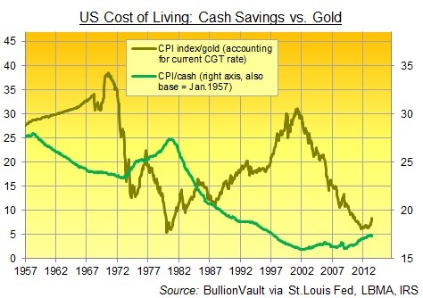 Since Richard Nixon cut the Dollar's last formal ties to gold backing four decades ago, the official US cost of living index has outpaced US savings rates in 198 months. Gold prices have risen in 163 of them, gaining an average – in real terms and after accounting for today's US capital gains tax – of 14.2% per year. That made the Consumer Price Index fall for gold-owning savers.