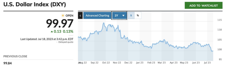 As of July 14, the dollar was down nearly 13% from last year’s two-decade high and was its lowest level in 15 months. According to Reuters, the softer-than-expected inflation print supports views that the Federal Reserve is nearing the end of its interest rate-hiking cycle.