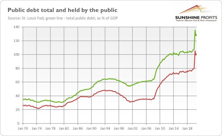What does the budget for the next fiscal year mean for gold prices? Well, although Trump was trumped in the last elections, trumpism is still doing well. Here I’m referring to the fact that Trump started to balloon the government spending and fiscal deficits well before the pandemic. Then the coronavirus hit and the fiscal policy became even looser. And now President Biden raises the stake, widening the budget deficit and public debt despite the recovery from the economic crisis.