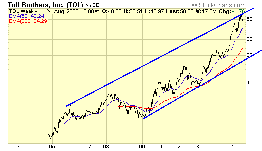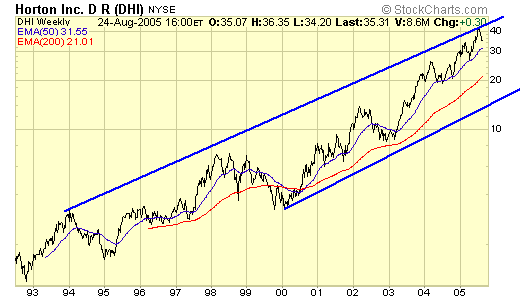 Many experts are calling this the biggest bubble of them all: the credit bubble. Again, I'm not smart enough to offer any opinion on why this and why that, but as far as I'm concerned, long term rates have been in a major down cycle since the early eighties, and as long as the major trend continues, long term rates will remain at generational lows and the housing market is just one of many beneficial recipients. I have used this same chart to suggest to my loyal readers these past few years that, until the major trend in long term rates changes, keep their mortgages on short term variable, and many are very happy about that. Now, lets take a look at some better known housing stocks within the same period…