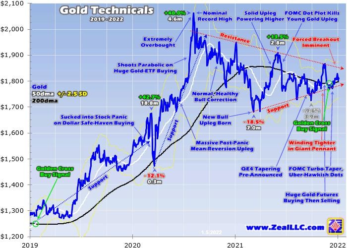 Enough selling to push the herd-psychology pendulum back to fear finally accrued by early March 2021, extending gold’s correction to 18.5% over 7.0 months. Its double-bottoming on gold-futures speculators capitulating began defining this pennant’s lower support line. Gold has mostly stayed bound within this constricting triangular high-consolidation ever since, largely thanks to specs’ leveraged gold-futures trading.