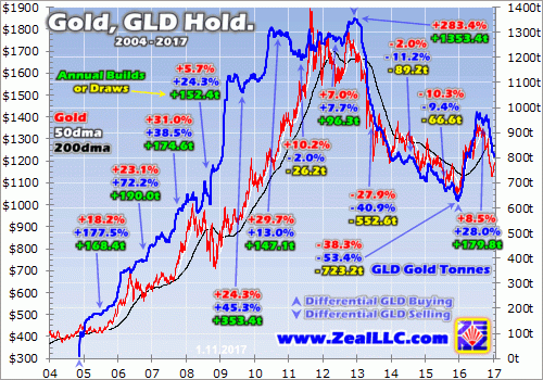 Despite the sharp post-election selloff driven by that Trumphoria stock rally, gold still advanced 8.5% last year. On Election Day it had been up 20.3% year-to-date! 2016 proved gold’s first up year since 2012. And not coincidentally, 2016 was the first year that saw a GLD build since 2012. And that 179.8t of gold-bullion buying GLD had to do last year was actually the third-largest GLD-build year in this ETF’s history.
