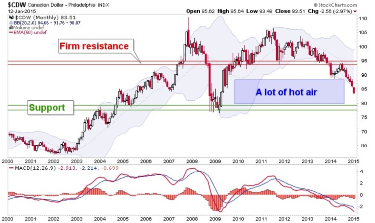 We noted the hot air patch in the Canada dollar last year. I had thought CDW might stop and find support at 85, which is a measurement from the topping pattern; but so far, no dice.