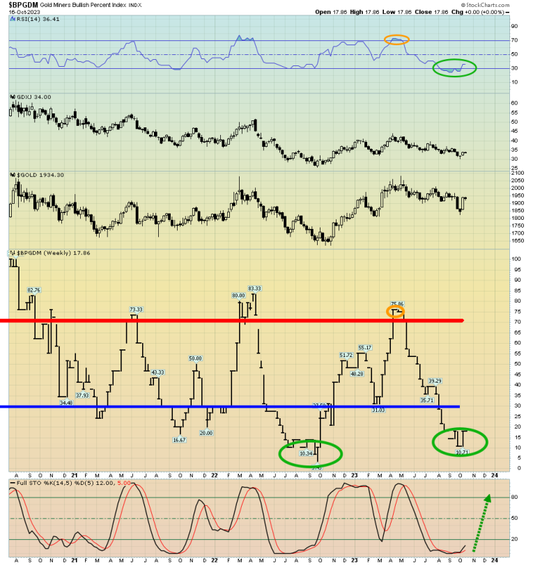 In addition, note the action of the BPGDM Stochastics oscillator at the bottom of the chart. I use the 14,5,5 series for weekly charts. This key oscillator is massively oversold; even after the mighty surge in gold, silver, and the miners, both the lead and lag lines are still under 20.