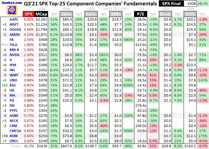 This table outlines the key fundamentals of these 25 largest companies in the US stock markets. Their stock symbols are preceded by how their rankings within the S&P 500 shifted in the year since the end of Q3’20. Next their percentage weightings within the SPX at the end of Q3’21 are shown, along with their enormous market capitalizations in billions when last quarter ended. That’s followed by year-over-year changes