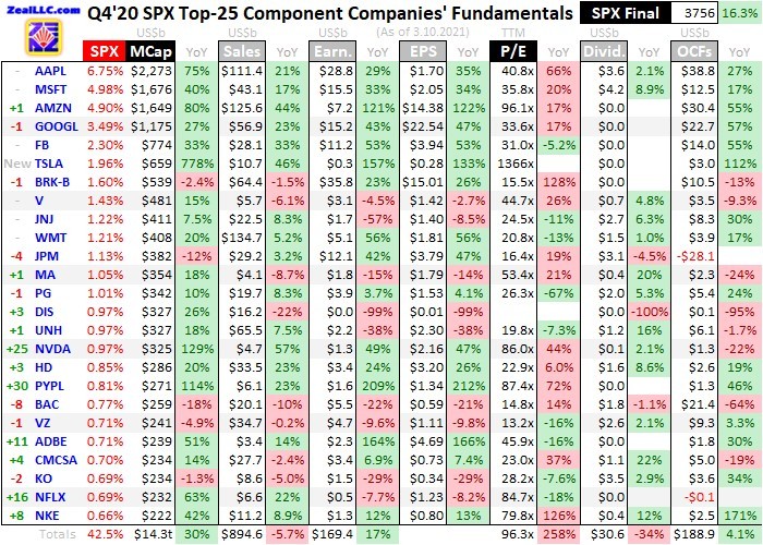 Overall the SPX top 25 averaged a scary-high P/E of 96.3x, which skyrocketed a meteoric 258.3% YoY! Thankfully that is misleading, because of the SPX’s monster new component Tesla. That manufacturer of electric cars is a cult favorite, attracting in huge amounts of retail capital at least partially financed by the government’s huge pandemic-stimulus payments over this past year. Tesla’s market cap soared 778% YoY!