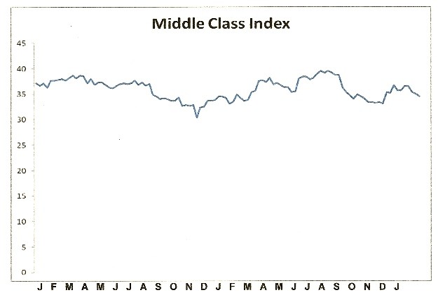 A repeal of the ACA’s individual mandate would also revive the fortunes of publicly traded companies which serve the middle class. Many of these companies’ stocks are components in our Middle Class Index (below). The Index has been languishing for the last two years, but I’d venture that an upside breakout from the lateral trading range would shortly follow an Obamacare repeal.