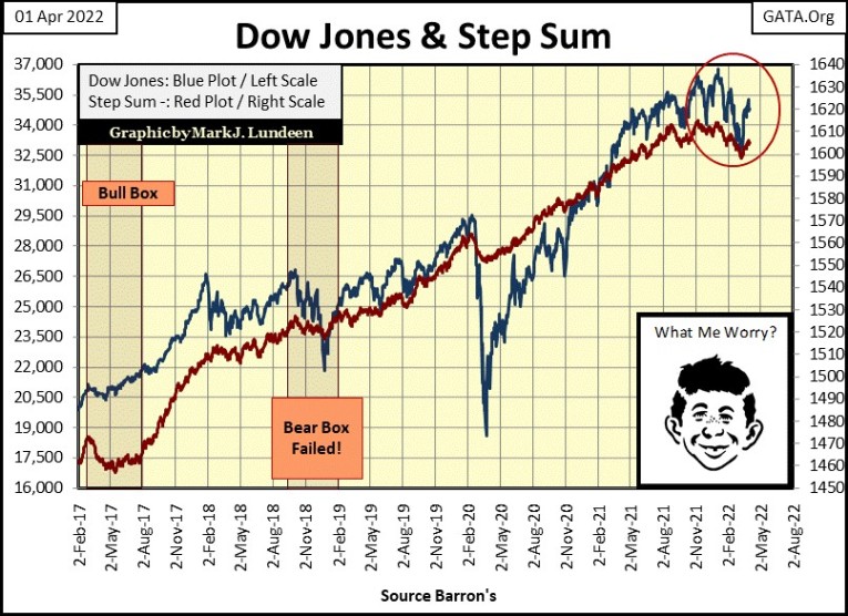 Here is the step sum chart for the Dow Jones, it too is little changed in the past few weeks. Like gold, we’re waiting to discover whether its next move will be a new all-time high, only a 5.3% advance from today’s close would do that, or if the Dow Jones will continue deflating, somewhere far below.