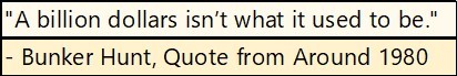 In a nutshell, today’s yields for US Treasury debt are market manipulations, yields that in no way compensate bond owners for the * MASSIVE RISKS * they have taken on holding so called riskless AAA rated-Treasury debt. What kind of massive risks are hidden in the Treasury bond market? At some point the idiot savants at the FOMC are going to lose their control over the bond market, and yields will rise. Then T-bond owners will discover, as did Bunker Hunt below, that a billion dollars isn’t what it used to be.