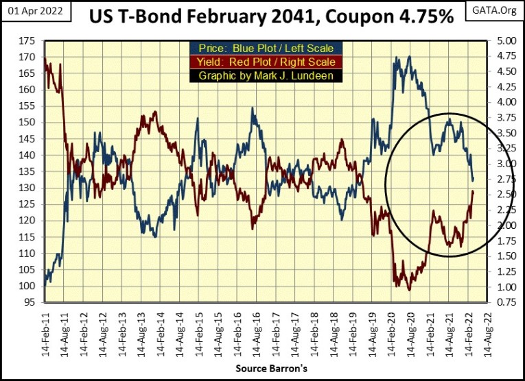 Below is a chart for a US Treasury 30Yr Bond issued in February 2011. In it, we see how variations in bond yields (Red Plot), impact bond prices (Blue Plot). As this bond’s yield increased from below 1% in August 2020, to 2.52% at this week’s close, this bond’s face value deflated by 22%, a loss of principle that overwhelms any annual coupon income this bond had ever paid to anyone who owned it.