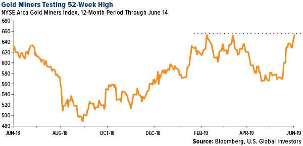Last week was a strong one for gold, which managed to eke out its fourth straight week of positive gains. The price of the yellow metal broke above $1,350 an ounce last Friday, while gold miners, as measured by the NYSE Arca Gold Miners Index, tested their 52-week high.