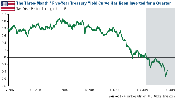 Last week the yield curve inversion between the five-year and three-month Treasury yields passed a key threshold that, in the past, has telescoped a recession. In a tweet dated June 13, Bloomberg’s Lisa Abramowicz shared a chart of the yield inversion and commented: “Cam Harvey, the economist who first linked an inverted yield curve to economic declines, pinpoints the 3-month/5-yr curve as a key recession indicator once it inverts for a full quarter. It officially finished a full quarter of being inverted yesterday,” meaning last Wednesday.