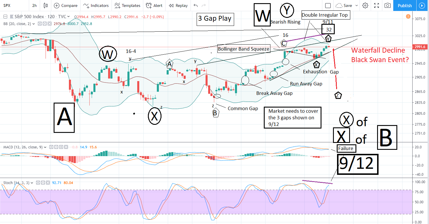 The third chart reiterates the Gann Cycles, the “3 Gap Play” and “Bearish Rising Wedge” with the waterfall decline to follow. The Common Gap at SPX 2848 should be filled next week.