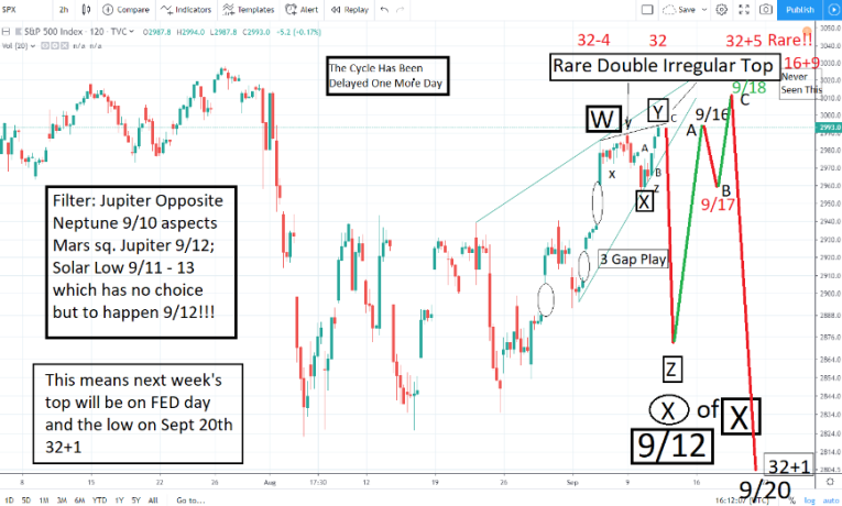 The cycles next week deviate from the norm by creating a half cycle Gann top (16+9 and 32+5 TD top on 9/18, the FED announcement day, which tends to create tops) near the expected Gann 32 TD low due on 9/19 only one day past the FED announcement!